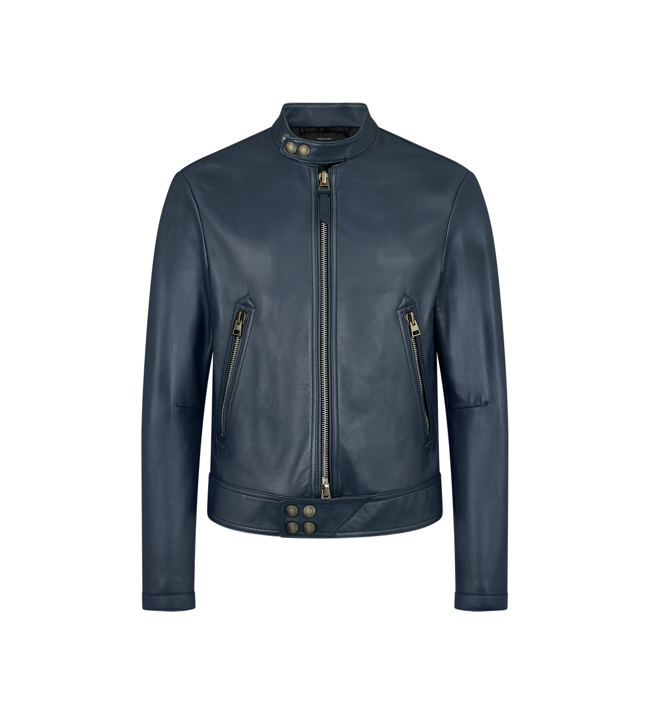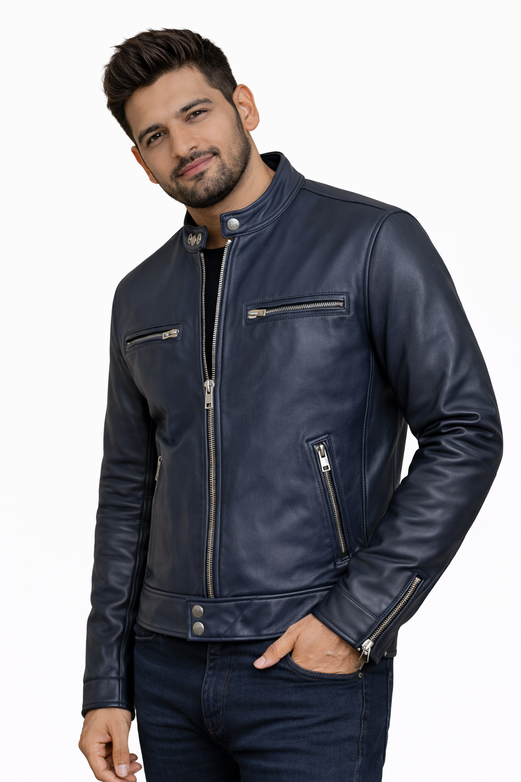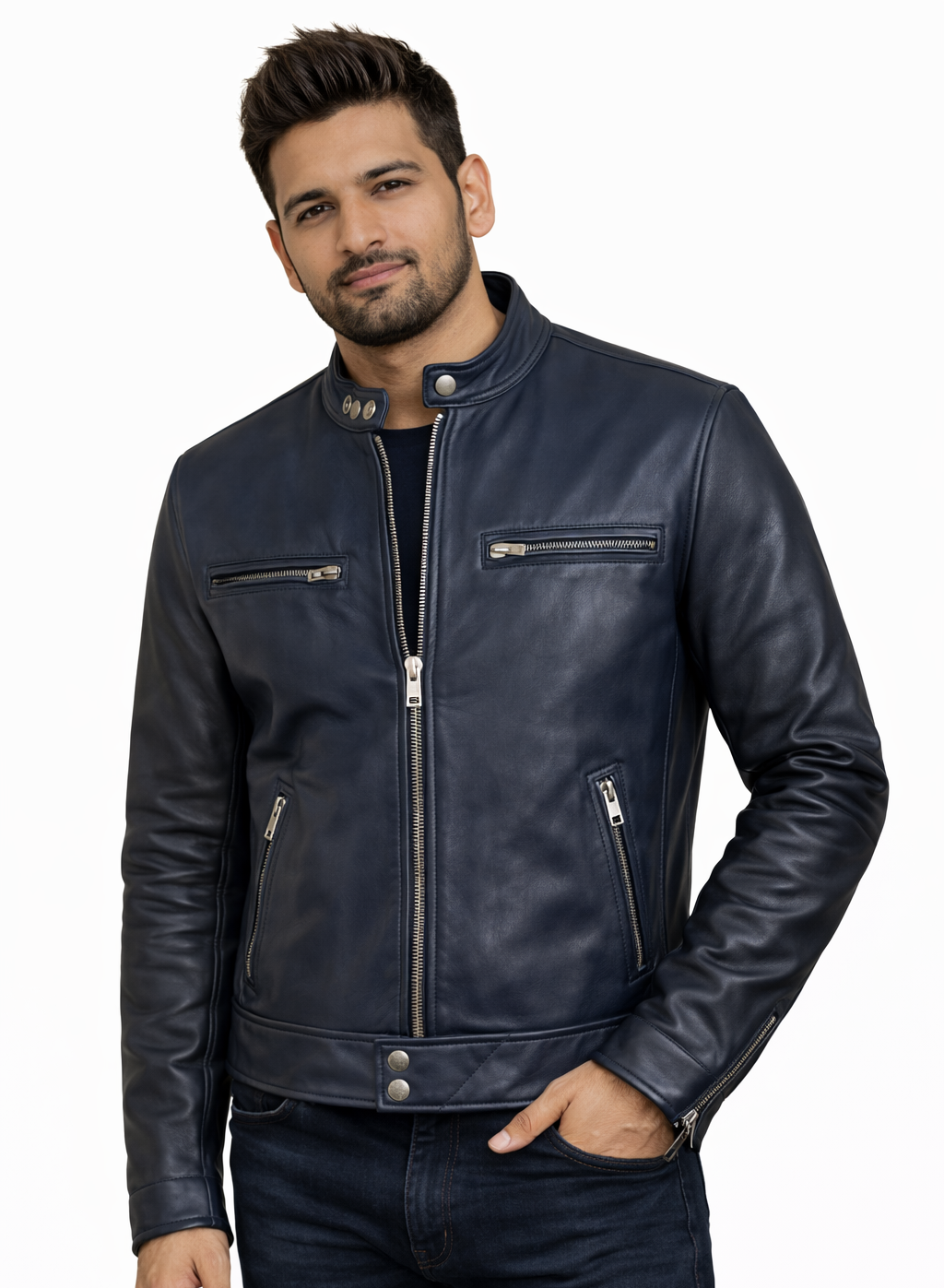 Crafted from premium grain leather, this jacket features a streamlined racer design with a stand collar, minimalist zip detailing, and precision stitching that enhances its sharp profile. The tailored fit hugs the body without restricting movement, making it ideal for both riding and elevated streetwear.