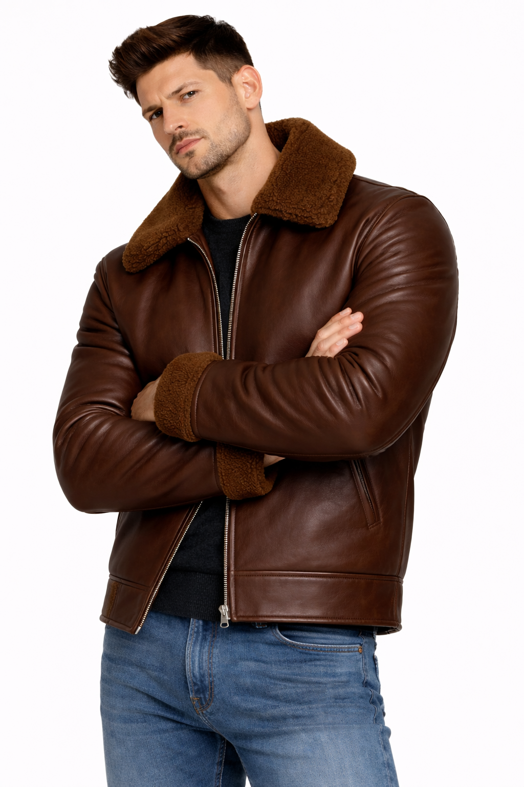Built for cold-weather strength and timeless style, the Stonewood Brown Bomber Jacket by Leather Factor delivers a powerful blend of warmth, durability, and classic bomber design. Crafted from premium brown leather and finished with a plush shearling collar and cuffs, this jacket is designed to handle winter while elevating your everyday look.