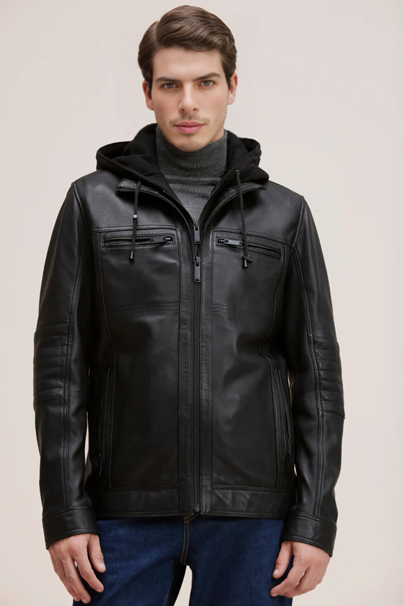 Engineered for riders who want comfort, style, and versatility, The PrimeFit Urban Biker Leather Jacket is crafted from premium genuine lamb leather that delivers a smooth feel with exceptional mobility. The removable zip-out hooded insert gives you two looks in one—keep the hood for a bold urban biker vibe, or remove it for a clean, classic riding silhouette. Designed with utility in mind, it includes secure chest and hand zip pockets, plus three interior pockets for your essentials. Sleek, durable, and modern, this jacket is built to elevate every ride—on the street or off.